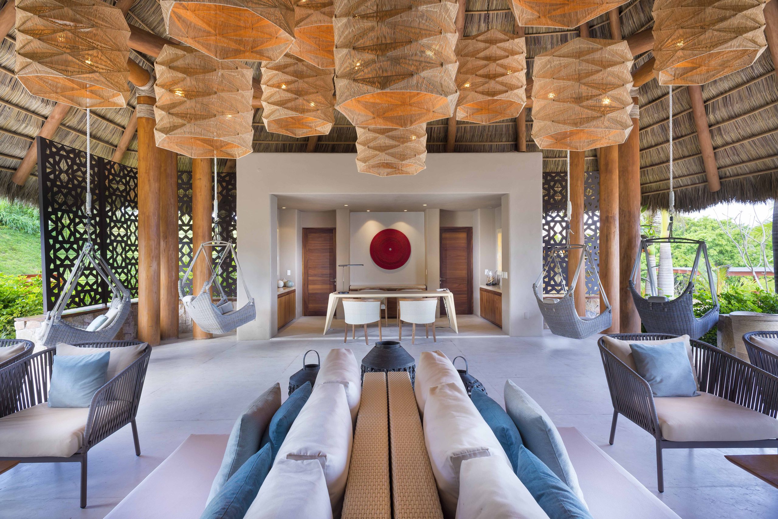 A beautiful space with a spectacular vaulted palapa roof. Guests can enjoy a wonderful meal or just relax, read, and unwind with their guests.